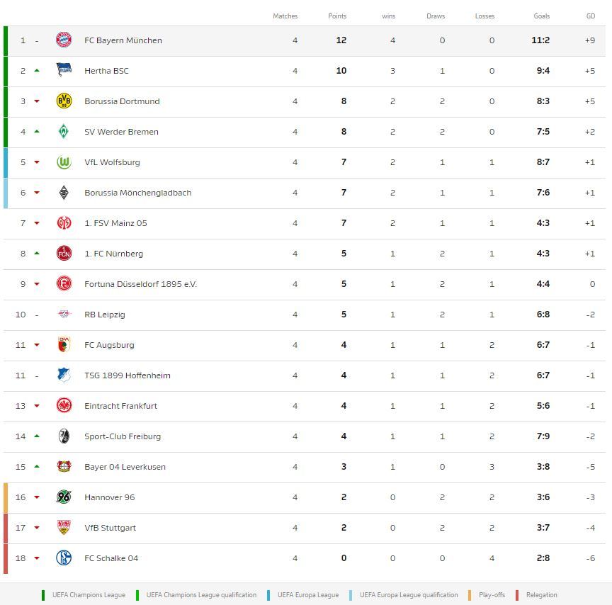 Etapa 4 din Bundesliga confirmă faptul că Bayern poate avea o nouă cursă solitară spre titlu. Continuă criza celor de la Schalke 04, iar Leverkusen obține prima victorie a sezonului, una la limită. Borussia Dortmund nu mai face același joc spumos, însă evită în cele din urmă înfrângerea la Hoffenheim, deși evolua cu un om mai puțin. Hertha impresionează în continuare, echipa lui Dardai reușind să păstreze dinstanța de doar 2 pct. față de Bayern, după o victorie importantă, contra celor de la Gladbach. Mai mult, berlinezii domină clasamentul golgheterilor și al pasatorilor din Bundesliga, prin 2 jucători cotați cu șanse minime să realizeze acest lucru, la începutul sezonului.