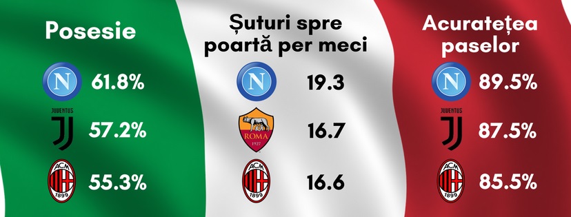 Posesie: Napoli 61,8%, Juventus 57,2%, AC Milan 55,3%, Atalanta 54,8%, AS Roma 54,6%.