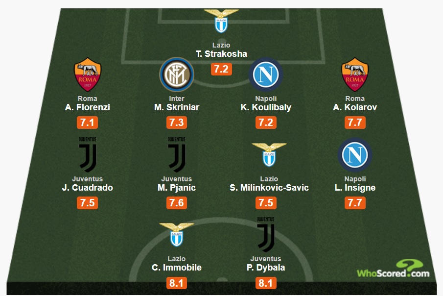 Strakosha – Florenzi, Skriniar, Koulibaly, Kolarov- Cuadrado, Pjanic, Milinkovic-Savic, Insigne- Immobile, Dybala