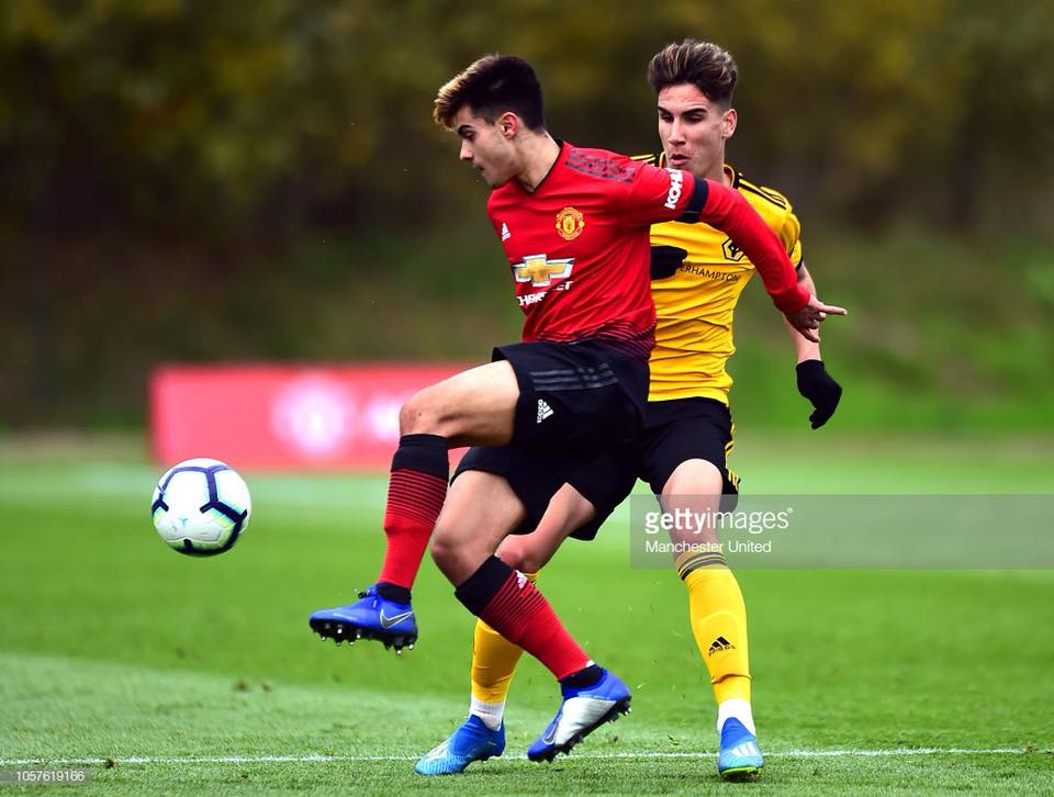 Theodor Corbeanu in a Premier League 2 duel against Manchester United’s Andreas Pereira. Photo by Getty Images.